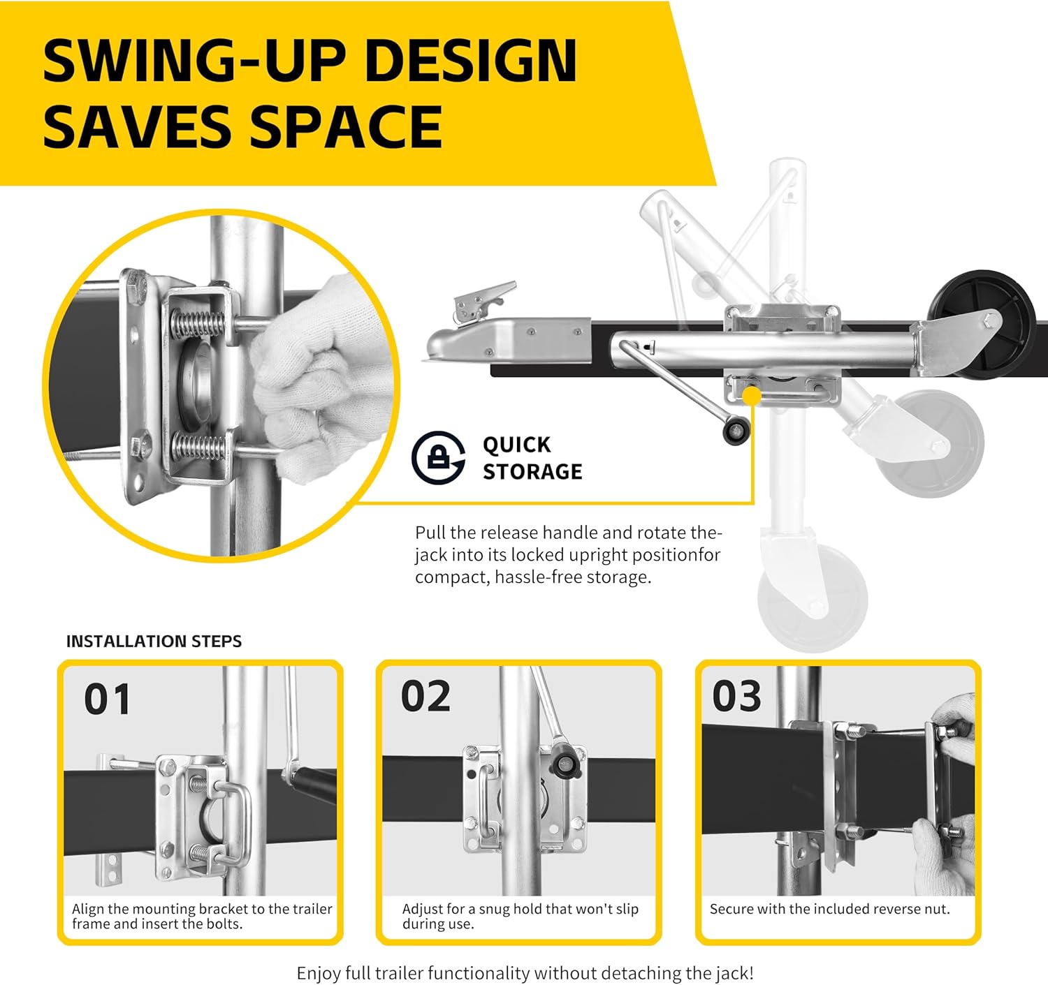 - Space-Saving Swing Back Design: This design optimizes space and allows you to use your trailer without uninstalling the trailer jack.